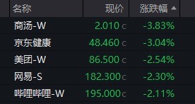 大型科技股走弱,美团、网易、哔哩哔哩跌逾2%。