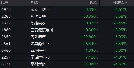 医药股多数下跌,药明合联跌超6%,药明康德跌近6%,四环医药、昭衍新药等跟跌。
