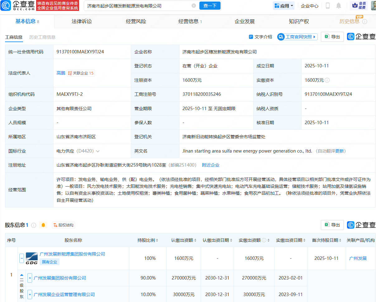 近日,济南市起步区穗发新能源发电有限公司成立在线股票配资平台,法定代表人为高鹏,注册资本为1600万元,经营范围包含:风力发电技术服务;太阳能发电技术服务;充电桩销售;集中式快速充电站;储能技术服务等。企查查股权穿透显示,该公司由广州发展(600098)旗下广州发展新能源集团股份有限公司全资持股。