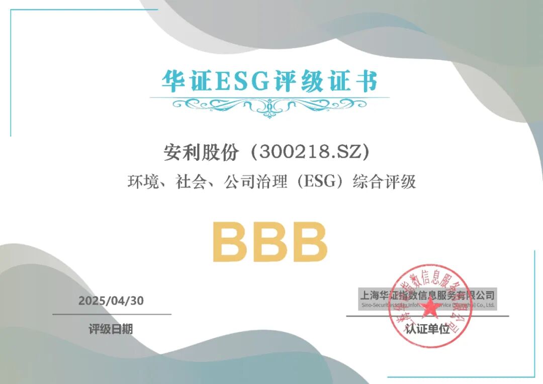 近期,在国内资本市场最具影响力的ESG评级中,安利股份(300218)(300218.SZ)凭借在环境、社会及公司治理(ESG)领域的持续深耕与系统推进,实现2025年ESG评级双双上调,标志着公司可持续发展能力得到了权威认证: