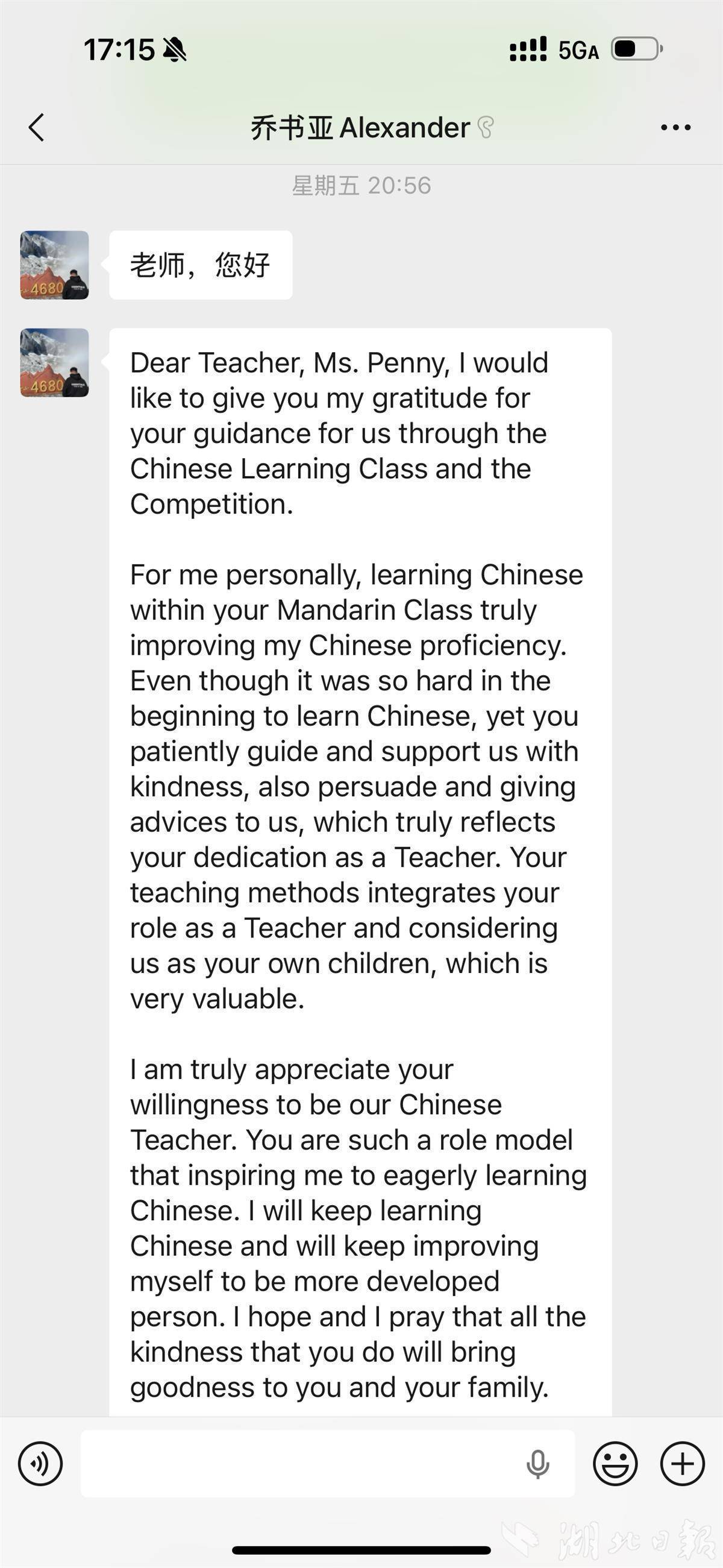 乔书亚在信中回忆:“就我个人而言,在您的中文课堂上学习中文确实极大地提高了我的汉语水平。尽管起初学习汉语时非常困难,但您始终耐心地引导和支持我们,并以友善的态度进行劝说和提供建议,这真正体现了您作为一名教师的敬业精神。”