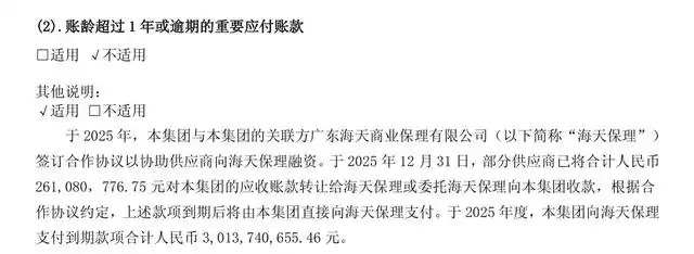财报中显示,海天味业协助供应商将应收账款转让给海天保理以快速回笼资金,2025年末,公司部分供应商将合计2.61亿元的应收账款转让给了海天保理,2025年度,海天味业向海天保理支付到期款项合计30.14亿元。